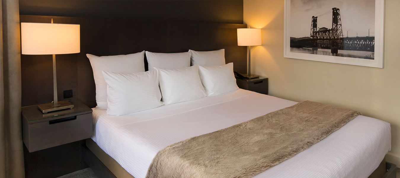 Take in sweeping views of the city from your plush king-size bed. Featuring a comfortable sitting chair, Executive desk and chair, 55” television, and a shower/tub combination.